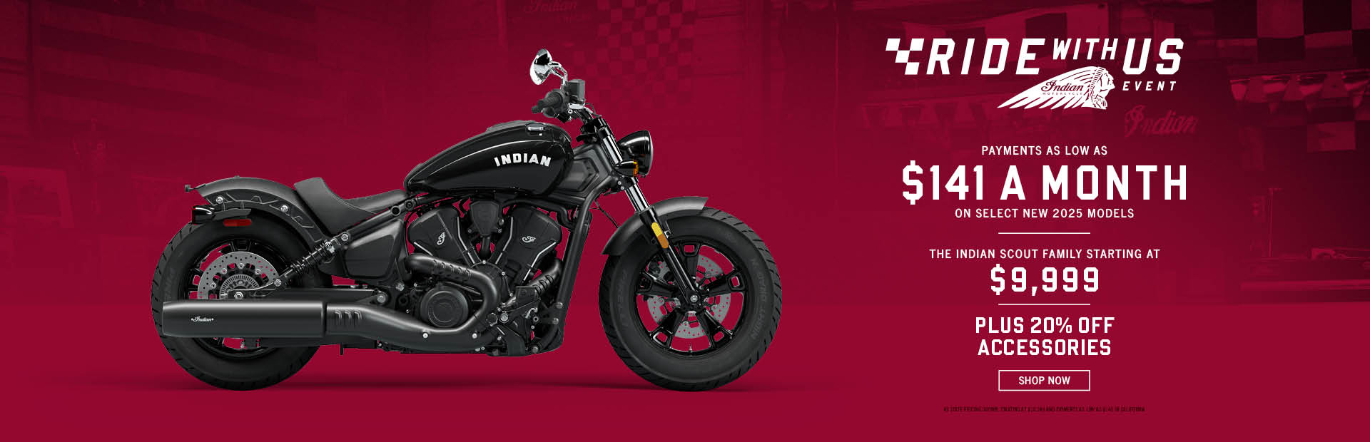 The Indian Scout Family Starting At $9,999 and Payments as Low as $141 a month on select new 2025 models. Plus 20% off accessories.